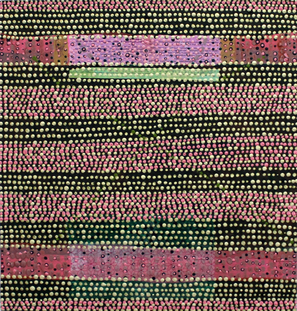 A Way Of Saying Goodbye features new work by Kevin Lucey. While the subject matter is implied by the title of the show and the included works, Lucey forges ahead in his signature style of laboriously layered abstract paintings. Each work initiates as a singular phrase from which he builds layer upon layer of dots and small strokes of paint. Through this process he effectively obliterates the text (it wasn't meant for the viewer anyway), to create visually rich and sometimes challenging works that read more closely to woven tapestries. Throughout the process, Lucey is also strongly influenced by color theory often implementing a play between an analogous and split compliment palette.