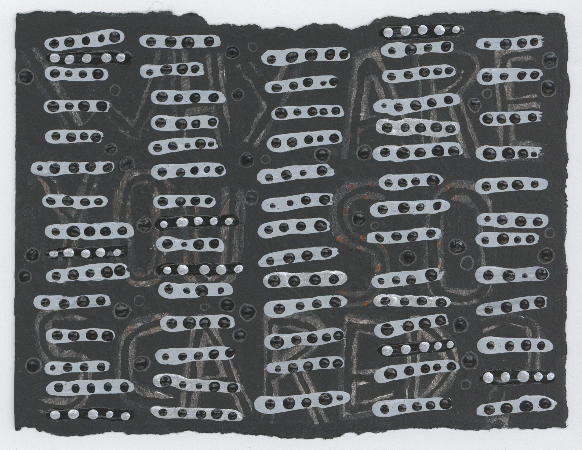 Also included in this exhibit are less formal, smaller works on paper. In many ways these works act as windows into Lucey's process, most obviously in the heightened presence of legible text. These works aid in de-coding his interest in pattern and palette.